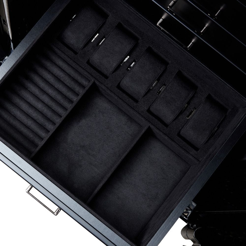 - Additional storage: 7 Black finished exterior, grey Lusterloc™ lined, pull-out drawers for watches, jewelry and accessory storage. 3 open drawers, 2 jewelry drawers, and 2 watch drawers.