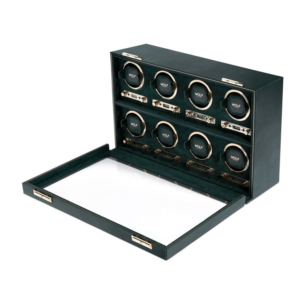 Handmade throughout, British Racing melds the green international motor racing colour of the UK’s cars raced in Ireland in the early 1900’s with a revolutionary quad angled panelled lid. Fine work detailing includes hand-pressed gold foil lines on vegan friendly pebble-grained leather. Gold hardware accents throughout with cushion close hinges and fluted bezel. Another design first from WOLF. Take your watches for a spin in the 8 piece watch winder.